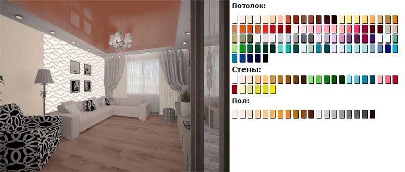 Натискаючи на колір стелі зверху, ви можете побачити фотографію інтер'єру з таким відтінком натяжної стелі. Ці поєднання стін, стелі, підлоги і меблів розробив наш дизайнер, щоб вам було простіше побачити кінцевий результат. Ми вирішили не робити інтерактивну можливість вибору окремо кольору стелі, стін і підлоги, тому що це виглядає не натурально. На нашому сайті ви можете просто перебираючи відтінки плівок - подивитися реальні інтер'єри, де підібрані не тільки стіни, але і фотошпалери, меблі та інші аксесуари в інтер'єрі. Більш докладно про вибір кольору і форми на нашому youtube каналі.Як обрати колір стелі: